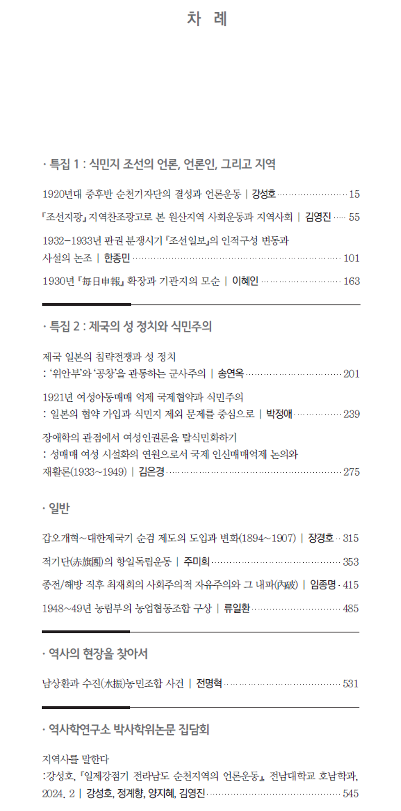 첫 번째 특집(‘식민지 조선의 언론, 언론인, 그리고 지역’)은 2024년 6월 역사학연구소 주최 학술회의 발표 논문을 바탕으로 구성되었다. 강성호와 김영진은 언론인의 활동과 언론 매체의 운영을 지역 상황과 연결하여 분석했다. 강성호는 1920년대 중후반 순천기자단의 조직을 전남 동부지역 사회운동과의 관계 가운데 조명하면서 그들의 기자대회 개최와 탐사보도 활동 등을 다뤘다. 김영진은 『조선지광』에 실린 1928년과 1930년 두 차례의 원산지역 지역찬조광고를 검토하여 『조선지광』의 매체 성격과 지역사회 네트워크의 변동과정을 연구했다. 두 사람이 이와 같은 연구를 전개한 맥락은 박사학위논문 집담회에서도 확인할 수 있다.