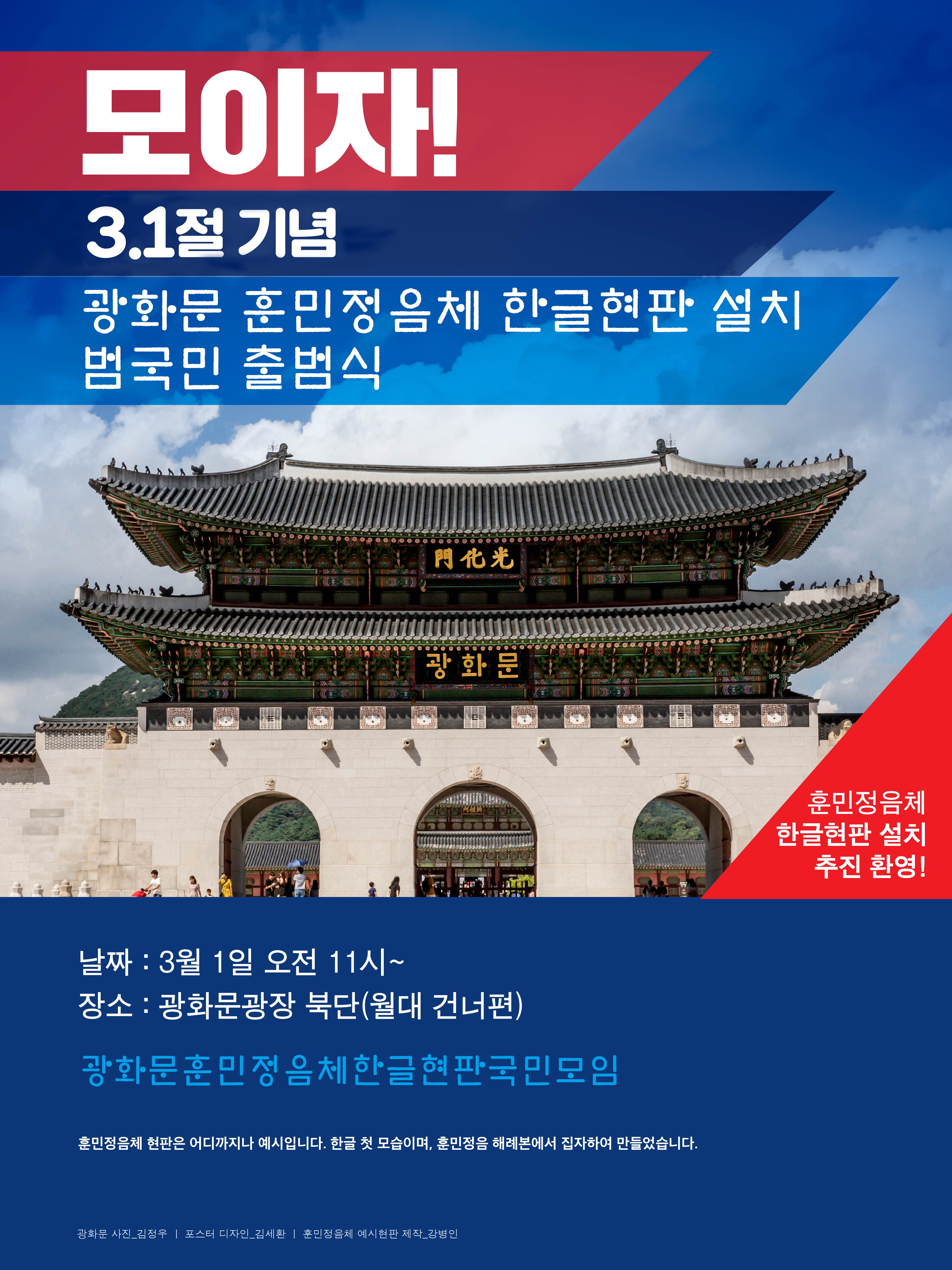이에 3·1절을 맞이하여, ‘광화문 훈민정음체 한글현판 달기 국민모임은 광화문에 훈민정음체 한글현판을 다시 달아 한글을 만든 세종 때처럼 나라를 일으키고 한글문화를 꽃피우자는 한글문화 독립 선언을 하는 바이다. 이 일은 사대주의와 일본 식민지 교육으로 뿌리내린 사대 의식과 식민 잔재를 떨쳐내고 자주정신을 살려 참된 자주독립국이 되는 일이며, 한글문화를 꽃피워 세계 문화 발전에 이바지하는 일이다. 대한민국 정문 광화문에 한글현판을 다는 것은 세종대왕과 한글에 목숨 바친 선열들의 꿈과 뜻을 살리고 빛내는 일이며, 그분들의 피땀 흘린 노력으로 선진 문화 혜택을 누리는 오늘을 사는 우리의 책무요, 시대 사명이다.