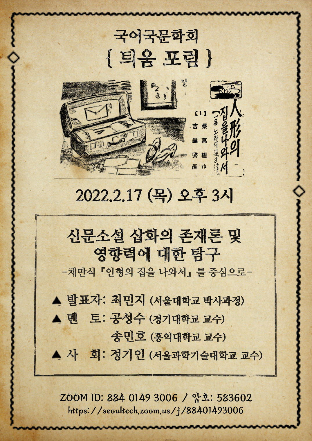 - 주제: 신문소설 삽화의 존재론 및 영향력에 대한 탐구-채만식 인형의 집을 나와서(1933)를 중심으로-